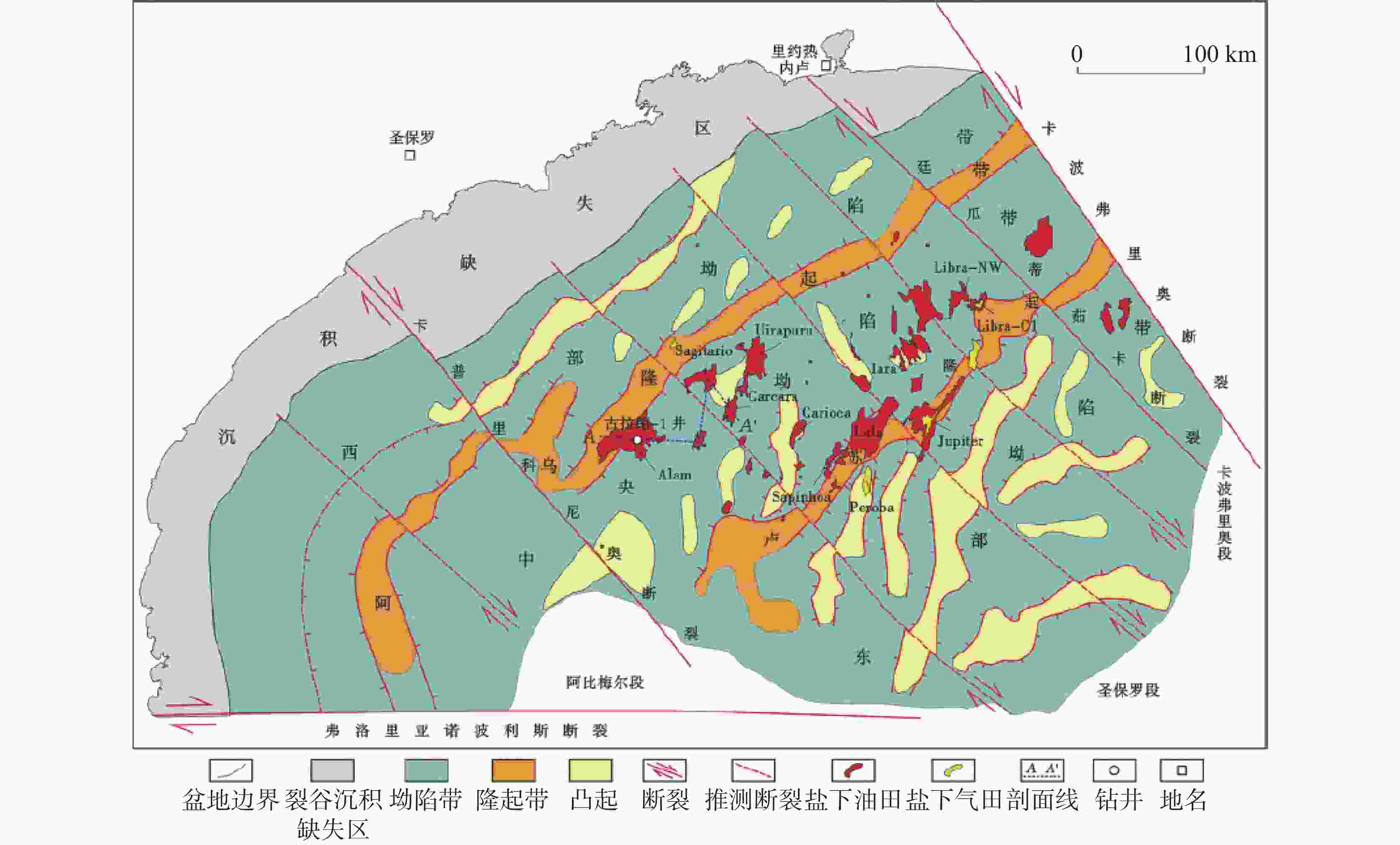 图 1 巴西桑托斯盆地盐下构造分区与油气田分布[8]