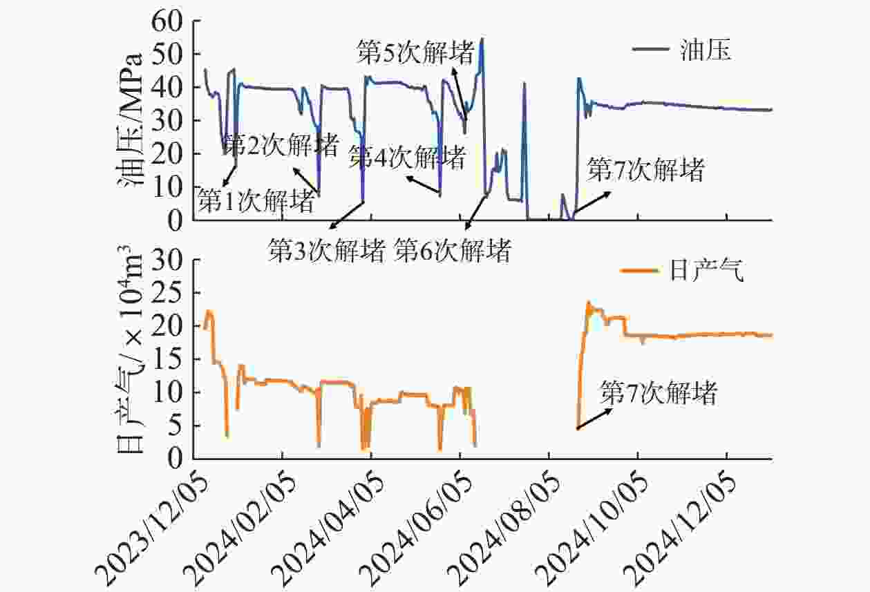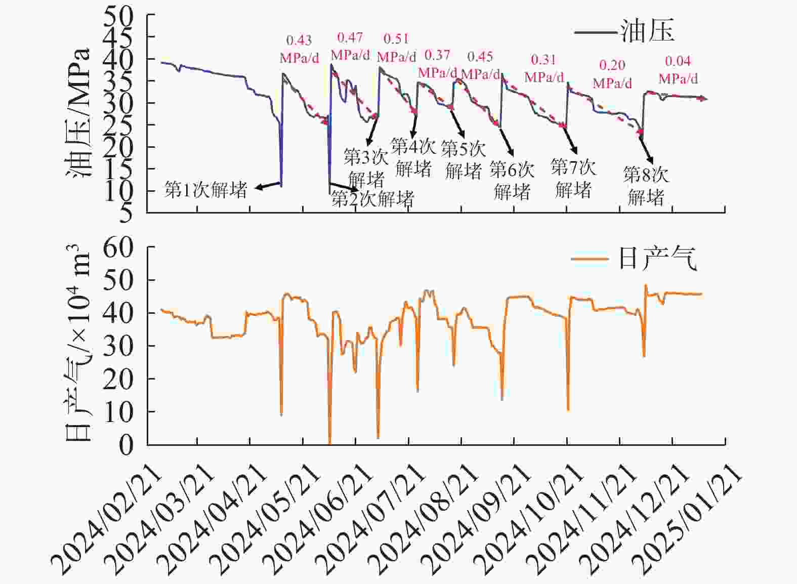 摘要: 川西雷口坡组气藏自2023年18口井陆续投产之后,已发生40余井次明显堵塞,严重影响气田产能释放。本文基于堵塞物系统检测和溯源分析,结合机器学习算法,研究了堵塞影响因素和井筒堵点分布规律,建立了基于“堵塞量化诊断”的堵塞井分类治理对策。研究结果表明:①堵塞类型可分为有机、无机、复合堵塞三类,堵塞物成分与国内部分含硫气田的早期具有一定的相似性;②早期堵塞与钻井、储层改造及完井工艺相关,主要堵点多沿生产管柱分布,在井口和水平井产层前段堵点数量略高于其它井段;③15%盐酸配制的酸性解堵液对无机堵塞物溶解率达65.7%,有机堵塞物降黏大于90%;④“堵塞量化诊断-连续油管”解堵工艺在41井次应用中实现100%解堵成功率,解堵后平均产能恢复率达128.6%。上述技术成果可为同类含硫气井堵塞治理提供借鉴。Abstract: The Leikoupo Formation gas reservoir in West Sichuan Basin has been significantly plugged for more than 40 wells since the 18 wells were successively started production in 2023, which has seriously affected the gas field production. Based on systematic analysis of plugging composition and origin, combined with machine learning algorithms, this study investigates the influencing factors and distribution patterns of downhole plugging zones. A classification and mitigation strategy has been established using quantitative blockage diagnostics. The results indicate that: ①Plugging types can be categorized into organic, inorganic, and compound plugs. The composition of solid deposits shows certain similarities with those observed in early-stage sour gas fields in other regions of China. ②Early-stage plugging is associated with drilling, stimulation, and completion operations. Most plugs are distributed along production tubing, with slightly higher frequency observed near the wellhead and in the front section of horizontal well production zones. ③Acidizing fluids prepared with 15% HCl achieve a dissolution rate of 65.7% for inorganic deposits and a viscosity reduction exceeding 90% for organic substances. ④The integrated process combining quantitative diagnostics with coiled tubing intervention achieved a 100% success rate in 41 field applications, with an average productivity recovery rate of 128.6% post-treatment. The above technical results can provide a reference for similar sulfur-containing gas well plugging management.