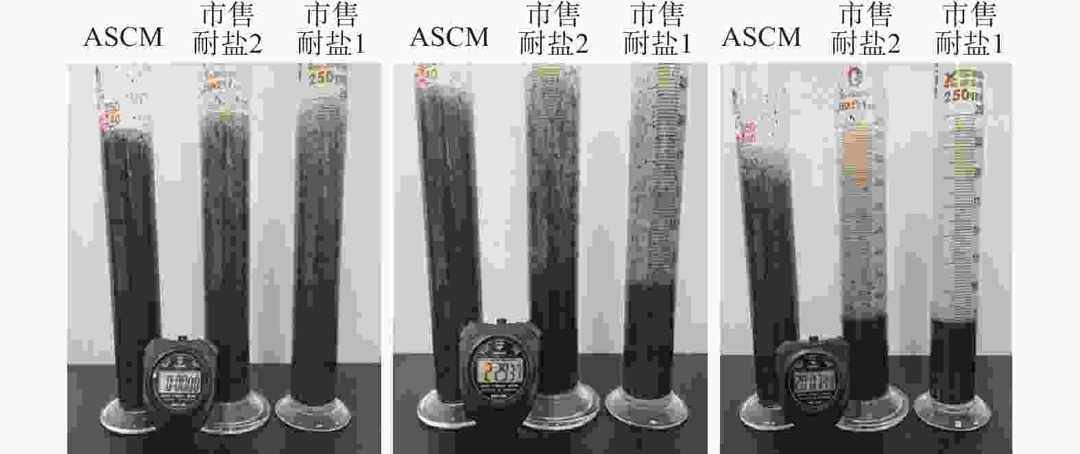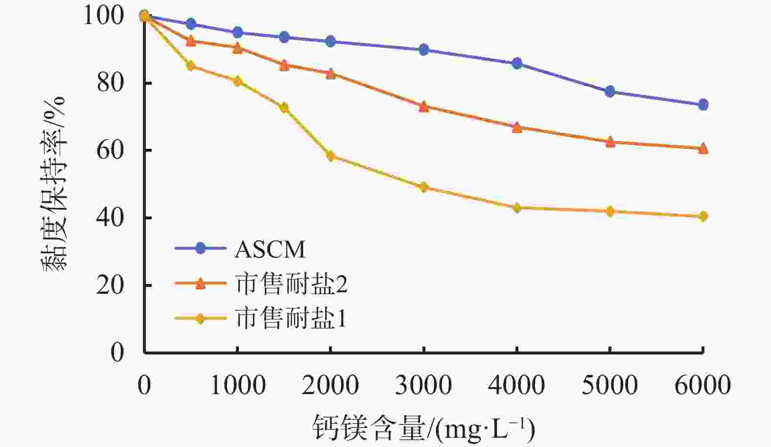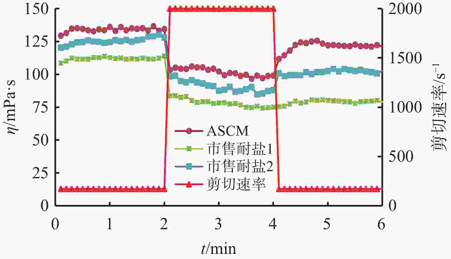 AM∶SSS∶DEAM∶CnDMAAC乳化剂/% 油水体积比 引发剂/% T/℃ 聚合单体质量浓度/% 8∶0.5∶1∶0.15 7 1∶1~1∶1.2 0.2~0.25 40~50 30 表 2 ASCM在不同水质中的溶解增黏性能