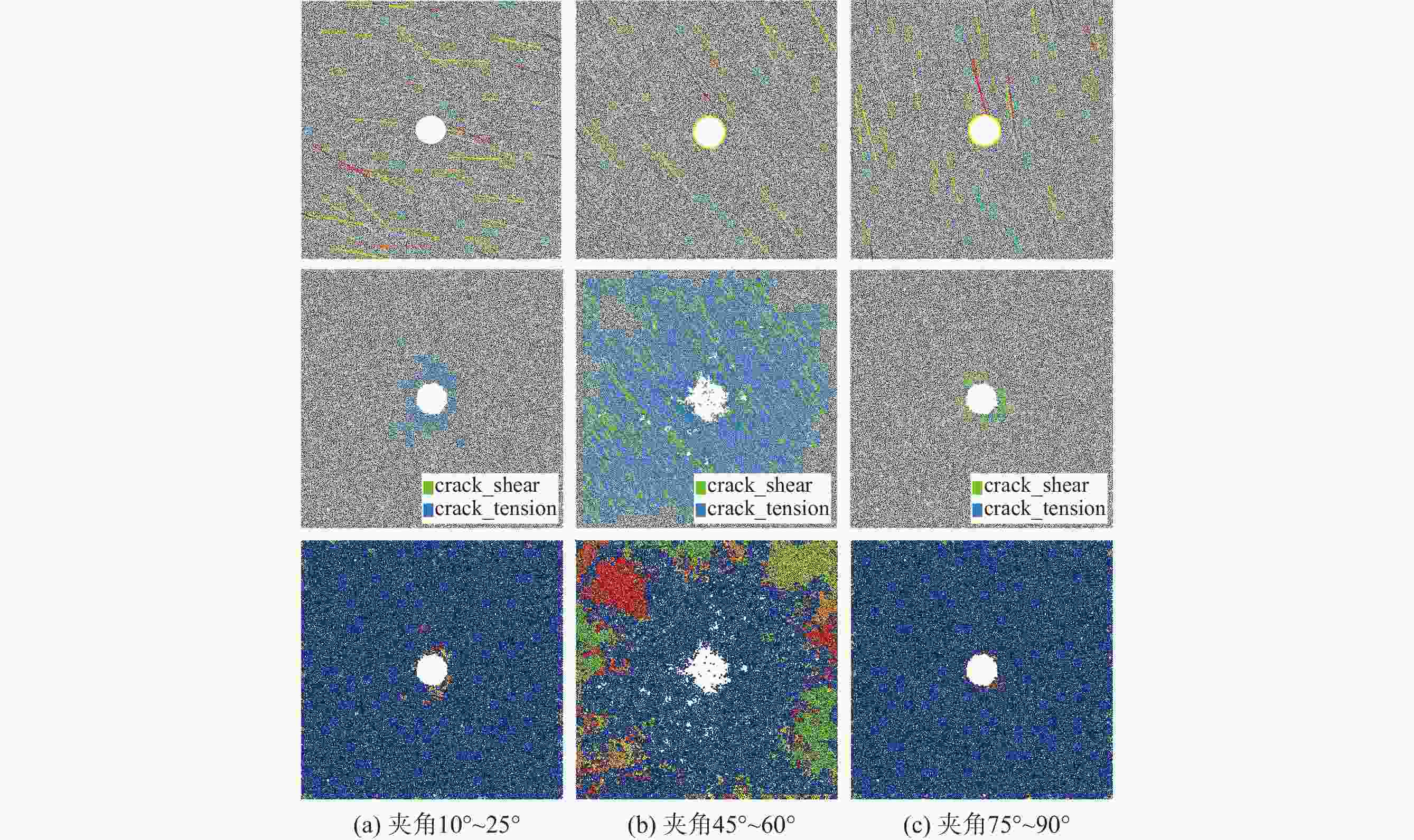 组别 细观参数 单位 取值 组别 细观参数 单位 取值 地层-井眼宏观参数 σH MPa 82.7 颗粒细观参数 弹性模量 GPa 35 σh MPa 76.3 粒径上限 mm 5.4~7.2 σv MPa 72.8 颗粒密度 g·cm−3 2.7 钻井液密度 g·cm−3 1.53 刚度比 无因次 3 井眼尺寸 mm 311.9 摩擦系数 无因次 0.5 平行粘结模型 法向刚度 GPa 24 000 平滑节理模型 法向刚度 GPa 11 100 切向刚度 GPa 8000 切向刚度 GPa 2400 弹性模量 GPa 35 摩擦系数 无因次 0.3~0.5 抗拉强度 MPa 8 抗拉强度 MPa 3 黏聚力 MPa 28 黏聚力 MPa 5 内摩擦角 35 内摩擦角 (°) 20 抗剪强度 MPa 15 抗剪强度 MPa 5 -