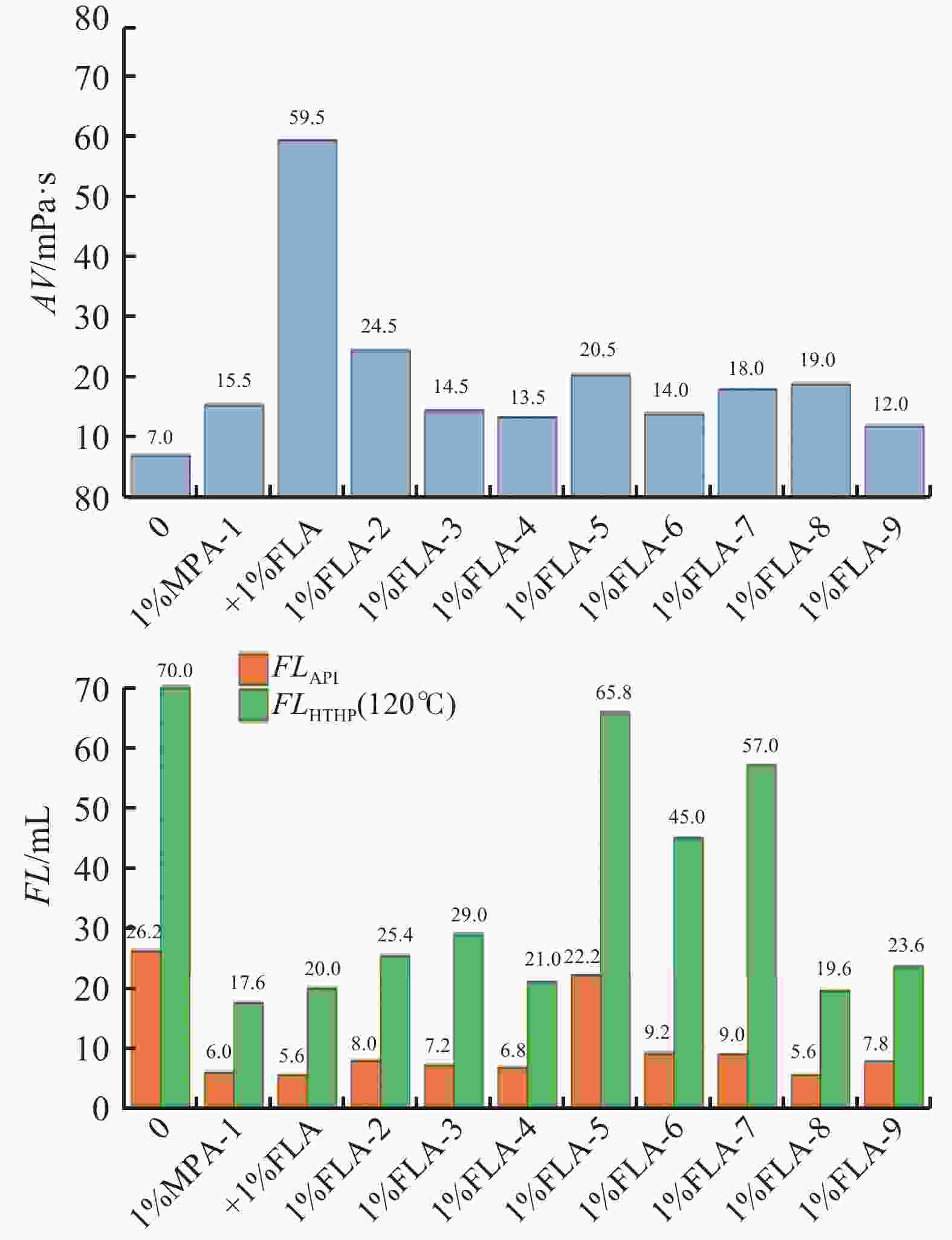 钻井液 Cl−/(mg·L−1) K+/(mg·L−1) MPA-1/% 实验条件 FLAPI/mL FLHTHP/mL AV/mPa·s PV/mPa·s 黏滞系数 钾胺基聚磺