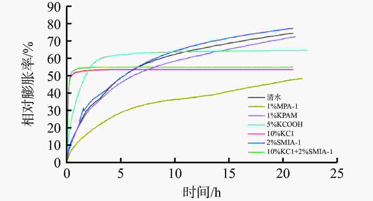 相对膨胀率/%0 120℃、16 h 7.0 26.2 0.2035 73.68 1 120℃、16 h 15.5 6.0 0.0262 46.77 140℃、16 h 15.0 6.4 0.0437 48.59 150℃、16 h 11.0 8.8 0.1317 59.30 注:膨胀率实验在对应配方去掉钠膨润土后的浆液中进行,取第20 h对应的膨胀率值。 表 5 在5%钠膨润土浆中加入不同处理剂的性能