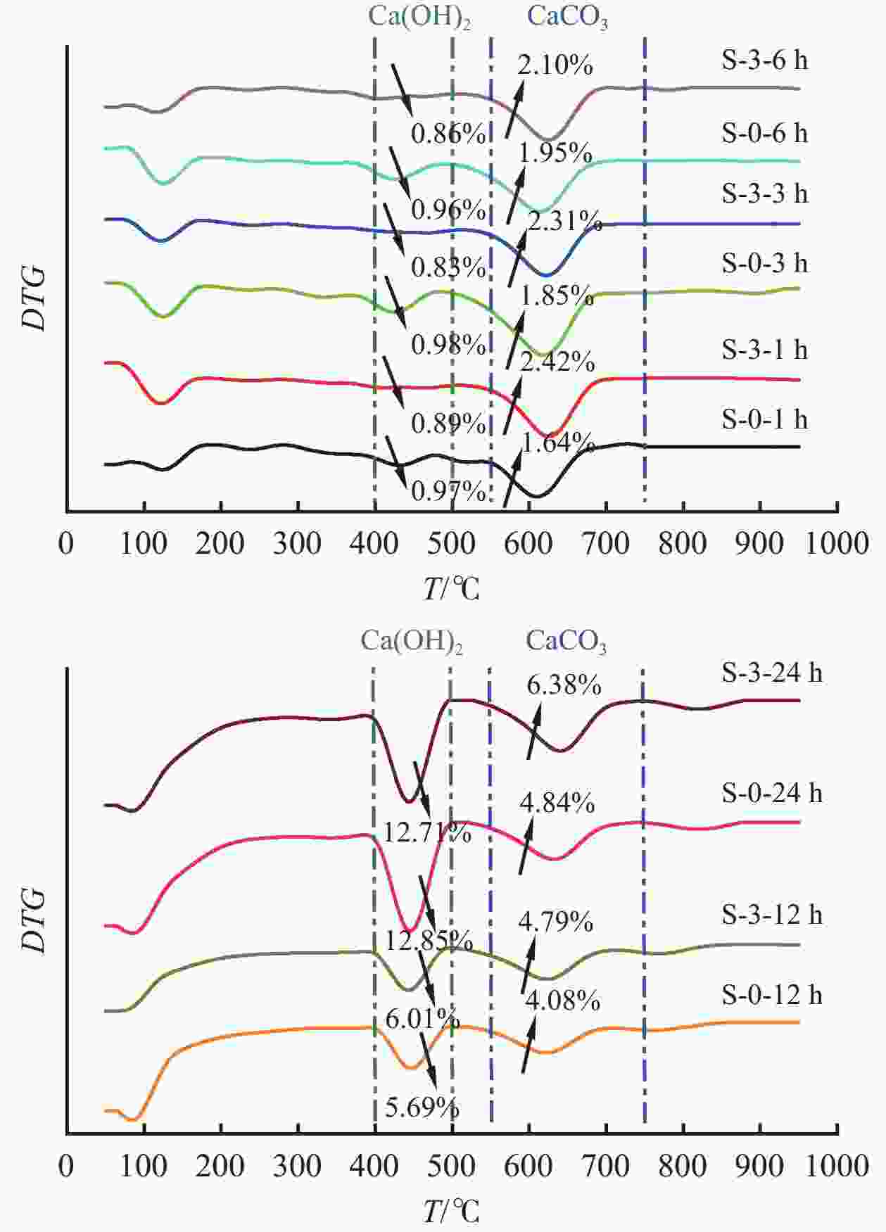 图  7  水化24 h内S-0和S-3各水化阶段DTG图谱