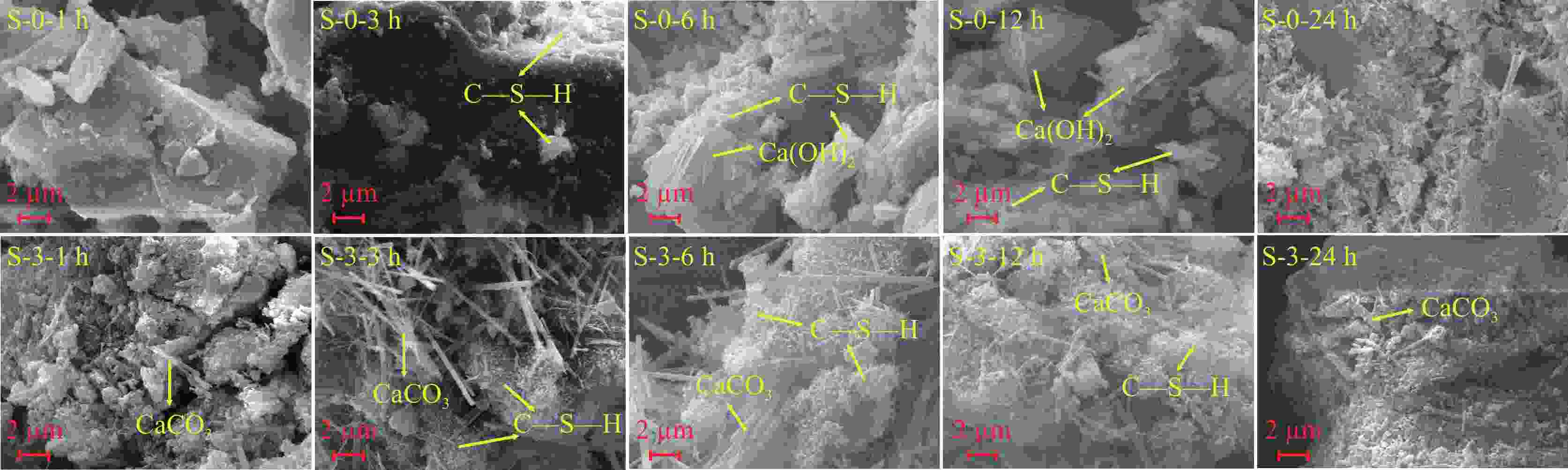 图  9  S-0和S-3在水化1~24 h的微观结构