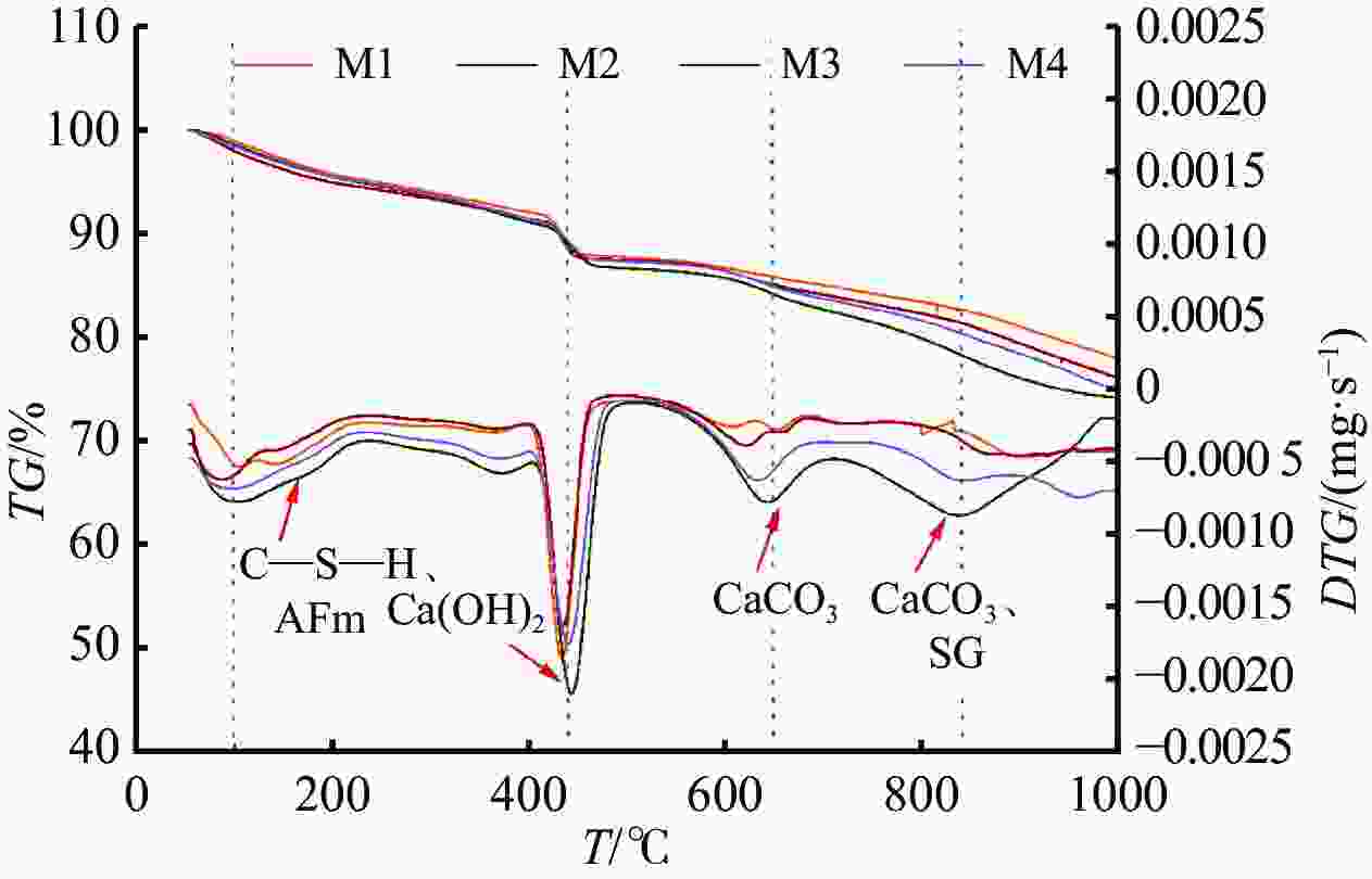 水泥石 不同温度(℃)下的质量损失/% 105~350 350~500 500~720 720~1000 105~1000 M1 5.70 5.34 2.96 6.72 20.73 M2 5.92 5.82 4.42 8.07 24.23 M3 5.23 4.99 3.56 7.61 21.39 M4 5.55 5.36 3.96 8.55 23.42 -