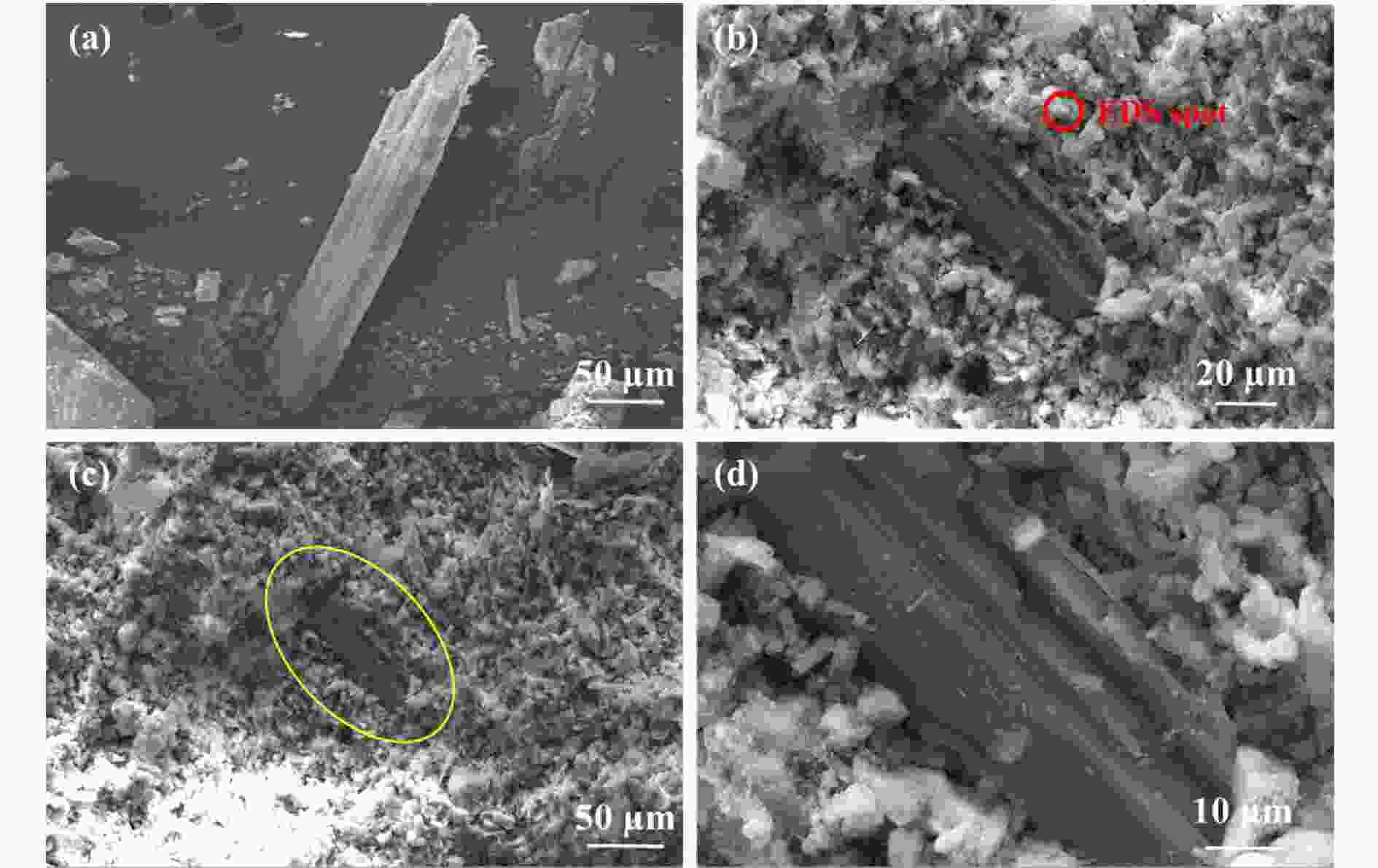 图  5  钙基晶须自修复剂(a)及养护28 d后2#水泥石裂缝表面放大不同倍数的SEM照片