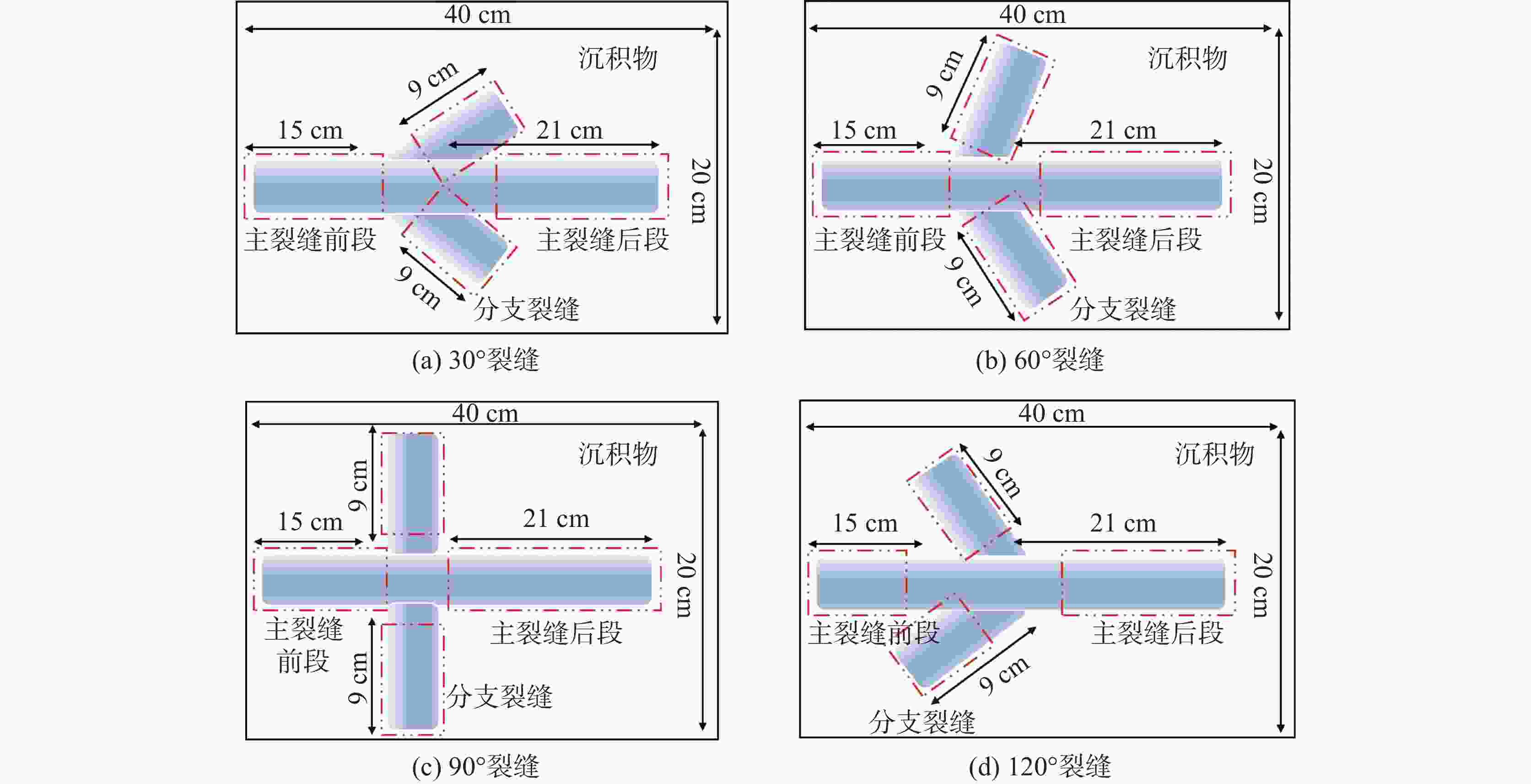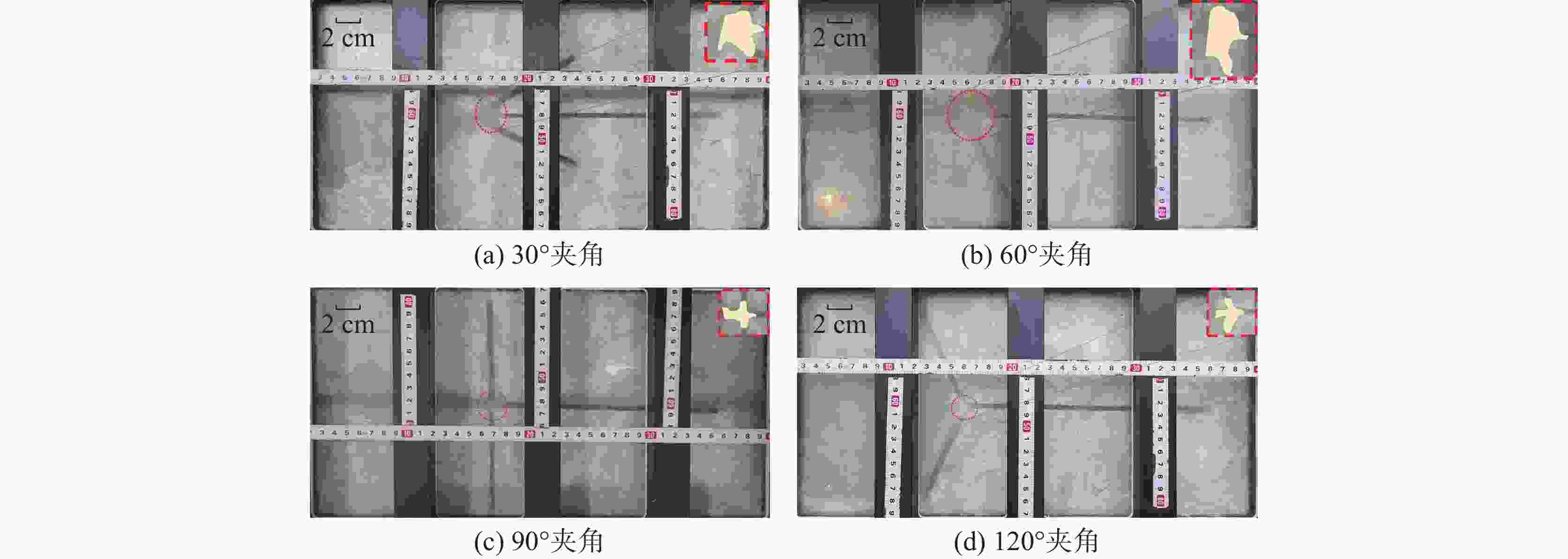 图  16  不同裂缝夹角下浆液流动填充示意图
