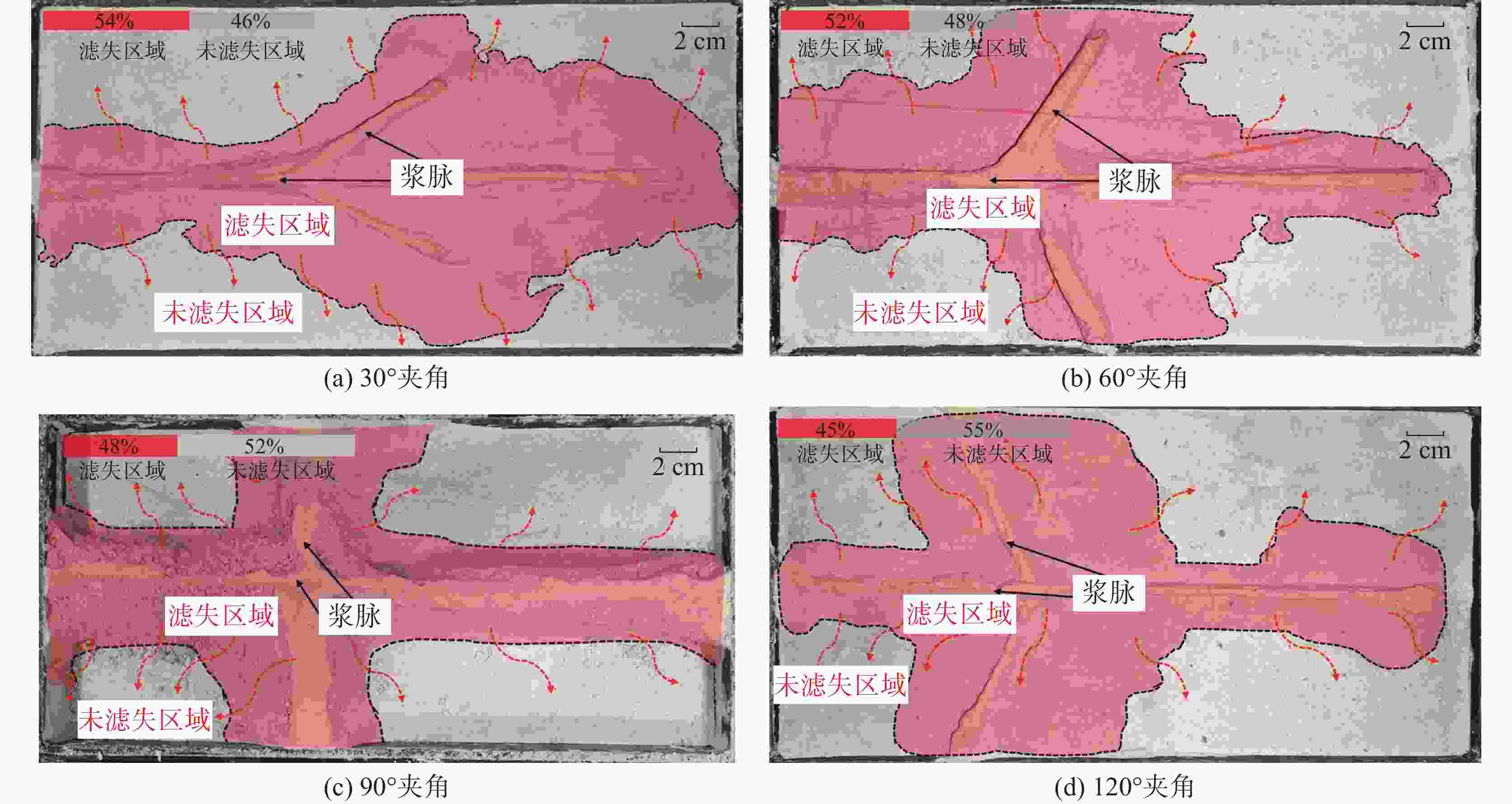 图  18  不同裂缝夹角下浆液滤失范围