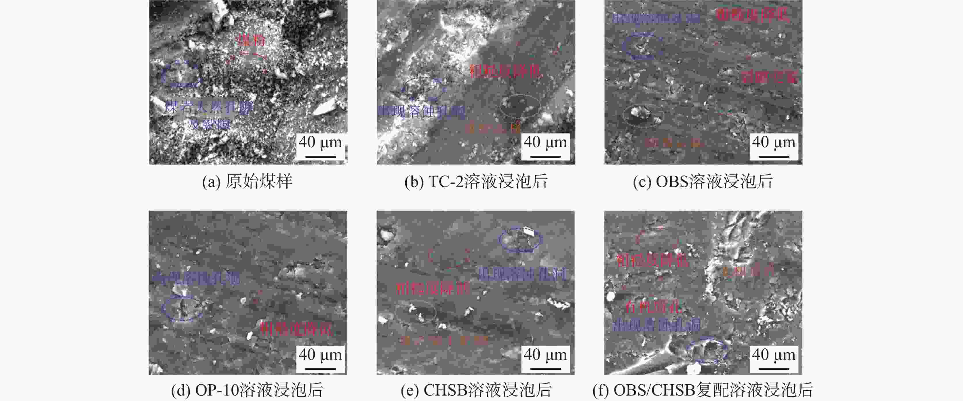 摘要: 针对深部煤层气开发中表面活性剂调控煤润湿性及甲烷解吸规律的关键问题,以鄂尔多斯盆地本溪组煤样为研究对象,探究了阳离子(TC-2)、阴离子(OBS)、非离子(OP-10)及两性离子(CHSB)四类表面活性剂对煤岩润湿性及甲烷解吸过程的影响规律。通过表面张力测试、接触角测试、Zeta电位表征、渗吸实验及微观形貌分析,发现OBS/CHSB复配体系通过阴离子与两性离子的协同作用,降低溶液表面张力至20.95 mN/m,并驱动煤岩接触角由原始状态减小至30.764°。这种协同效应源于磺酸基团的强负电性诱导双电层扩张,迫使表面活性剂分子以亲水基外延模式定向排列,同时甜菜碱基团通过电荷屏蔽效应缩减胶束尺寸,增强溶液对有机质-黏土矿物界面的渗透能力,进而诱导次生溶蚀孔隙发育。红外光谱分析进一步表明,OBS处理通过竞争吸附显著提升煤表面羧基(—COOH)含量至18.88%,而TC-2通过π-π共轭效应增加了在煤岩表面的吸附。甲烷解吸实验表明,OBS/CHSB复配体系在0.5%浓度下甲烷解吸量达7.37 mL/g,较原煤提升78.5%,其作用机制可归因于润湿性优化与孔隙连通性增强的协同作用,前者削弱毛细管力对甲烷的束缚,后者形成多级扩散通道,最终实现扩散-渗流双模传质效率的同步提升。现场应用中,添加0.3%促解吸剂的压裂井5 d即见气,稳产气量维持在6.6×104 m3/d。研究证实,表面活性剂复配体系通过“电荷匹配-孔隙重建-传质强化”的协同机制,克服了润湿性调节与孔隙堵塞之间的矛盾,为深部煤层气资源高效开发提供理伦依据。Abstract: To address the key issue of surfactant-controlled coal wettability and desorption of methane in deep coalbed methane (CBM) development, coal-rock samples were taken from the Benxi Formation of the Erdos Basin to study the pattern of how surfactants, including cationic surfactant (TC-2), anionic surfactant (OBS), nonionic surfactant (OP-10) and zwitterionic surfactant (CHSB), affect the wettability of the coal rocks and the desorption process of methane. It was found in laboratory experiments, including surface tension measurement, contact angle measurement, Zeta potential characterization, imbibition experiment and micromorphology analysis, that the composite surfactant system OBS/CHSB, with their synergistic effect between the ionic surfactant and the zwitterionic surfactant, reduces the surface tension of the solution to 20.95 mN/m, and decreases the initial contact angle of the coal-rocks to 30.764°. This synergistic effect comes from the strong electronegativity of the sulfonic acid groups, which induces the expansion of the double electric layer, forcing the surfactant molecules to have their hydrophilic groups oriented outward. Meanwhile, the betaine groups of the surfactant CHSB reduce the micelle sizes through the charge shielding effect, enhancing the penetration capacity of the solution through the organic matter-clay mineral interface and further inducing the development of secondary solution pores. Fourier transform infrared spectroscopy (FT-IR) analysis further indicated that OBS treatment, through competitive adsorption, significantly increases the content of the carboxylic group (-COOH) on the coal surfaces to 18.88%, while TC-2, through π-π conjugation effect, increases its adsorption capacity on the coal surfaces. Methane desorption experimental results showed that at 0.5% OBS/CHSB composite surfactant treatment, the desorption capacity of methane reaches 7.37 mL/g, a percent increase of 78.5% over the raw coal. The mechanism of this effect can be attributed to the synergistic effect between wettability optimization and pore connectivity enhancement: the former weakens the confinement of capillary force on methane, while the latter forms multi-stage diffusion channels, hence achieving the synchronous improvement of diffusion-seepage dual-mode mass transfer efficiency. In field application, wells fractured with 0.3% desorption accelerator treatment in the fracturing fluids can produce gas in 5 days, with a stable gas production rate maintained at 6.6×104 m3/d. The study confirmed that the composite surfactant system overcomes the contradiction between wettability regulation and pore plugging via the synergistic mechanism of “charge matching-pore reconstruction-mass transfer enhancement,” providing a theoretical basis for the efficient development of deep CBM resources.
