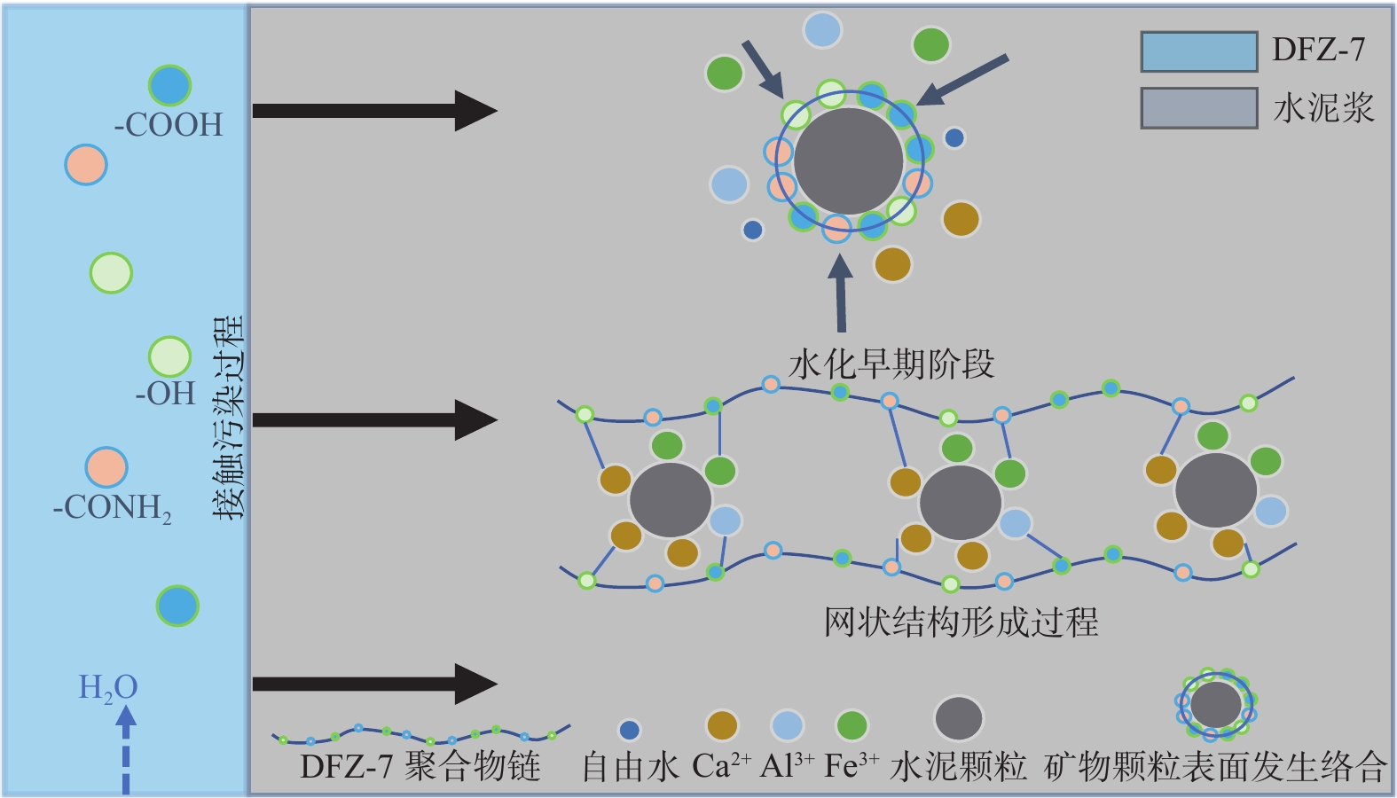 To solve the contact contamination between a cement slurry and a drilling fluid, drilling fluid additives that impose serious contamination to the cement slurry are selected and studied to understand their mechanisms of contamination and to find ways of preventing the contamination. As one of the commonly used drilling fluid additives, shale inhibitor DFZ-7 has significant effects on the rheology of the cement slurry. The effects of DFZ-7 on the performance of the cement slurry and its contamination mechanism were investigated by means of fluidity test, compressive strength test, XRD, IR, TG and SEM etc., and as a result of the investigation, an effective anticontamination strategy was developed. Experimental results show that at the early stage of cement hydration, the active groups in the DFZ-7 molecules can complex with the metallic cations on the surfaces of the cement particles to form network structures which hinder the movement of free water, causing the fluidity of the cement slurry to decrease and the viscosity thereof to increase. An anticontamination agent named KW was prepared by mixing aminotrimethylenephosphonic acid (ATMP) and titanium dioxide (TiO2) in a mass ratio of 5∶1. KW can be used to solve the contamination of DFZ-7 to the cement slurry through chelation and interstitial action. By adding 5% KW in the cement slurry, the fluidity of the cement slurry returned from 17.6 cm to 23.8 cm, and the strength of the set cement aging at 90 ℃ for 1 d was increased from 1.56 MPa to 8.74 MPa. A mixture of the cement slurry and a drilling fluid (cement slurry∶drilling fluid = 7∶3) had a thickening time of 55 min under the test conditions of 205 ℃ × 125 MPa × 110 min. After treatment with KW (cement slurry∶drilling fluid∶spacer = 7∶2∶1), the thickening time of the mixture was increased to 353 min, satisfying the needs of operation. In the set cement, the number of the network structures generated by DFZ-7 complexation decreased and the content of hydration products increased. The incorporation of KW can solve the contact contamination to the cement slurry by DFZ-7, without changing the composition of the hydration products of the cement slurry.