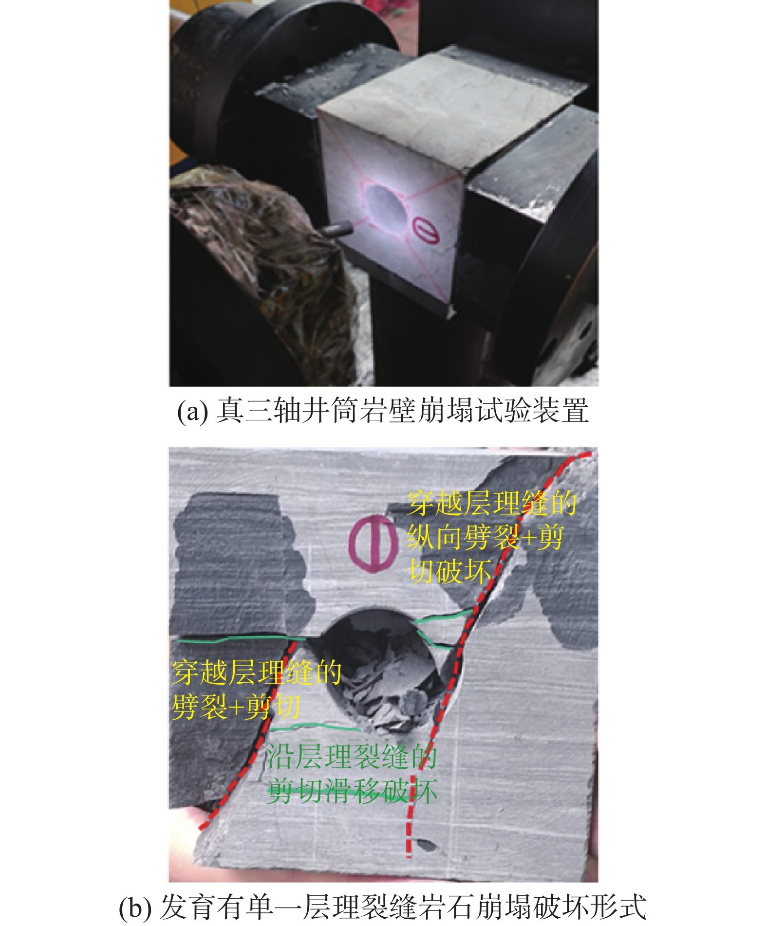 To deal with the wellbore collapse and instability problems encountered in drilling the broken marine carbonate formations in Shunbei and western Sichuan, a visual true triaxial wellbore instability physical simulation experimental platform was prepared and used to study the microstructural characteristics, physiochemical characteristics and mechanical properties of the broken formations, and it was understood that concentrated geostress, formation fragmentation and the mechanical-chemical coupling effect between the drilling fluid and the rocks are the main controlling factors for wellbore instability. By introducing a formation integrity coefficient, a parameter relationship between the “formation integrity coefficient + drilling fluid soaking” and formation mechanics was established. Based on finite element simulation, the distribution of the geostress of the broken formations was revealed. Based on equivalent rock mechanics parameters and taking into account the chemical interaction between drilling fluid and rock, a collapse pressure prediction model based on M-C criterion was constructed. The prediction accuracy of collapse pressure in typical wells, such as the well SHB9X, PZ5-3D and PZ6-5D, is as high as 86.0%-93.9%.