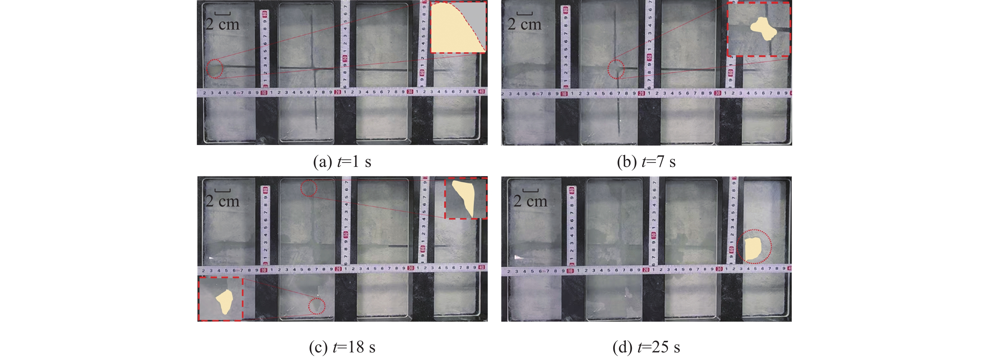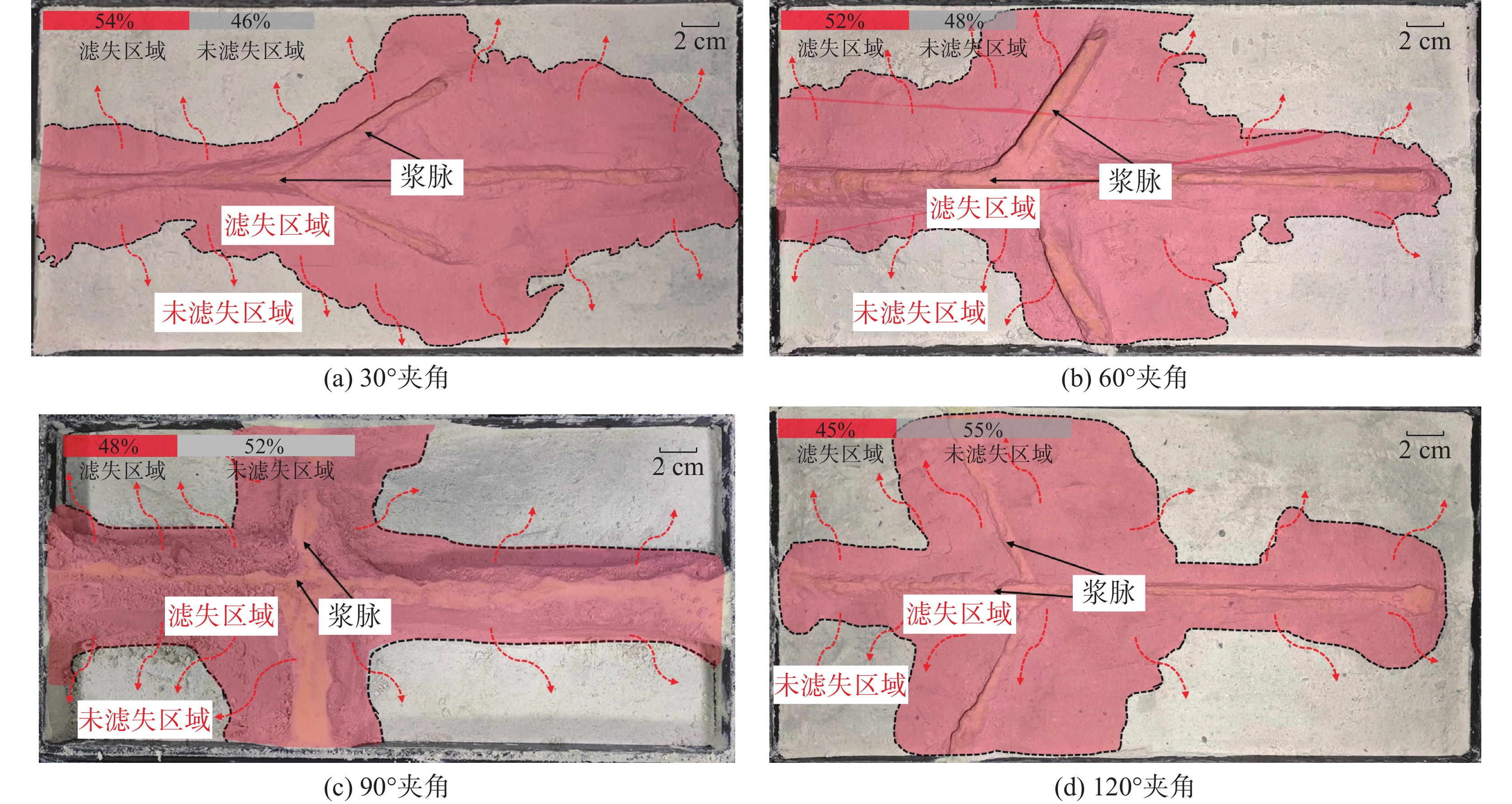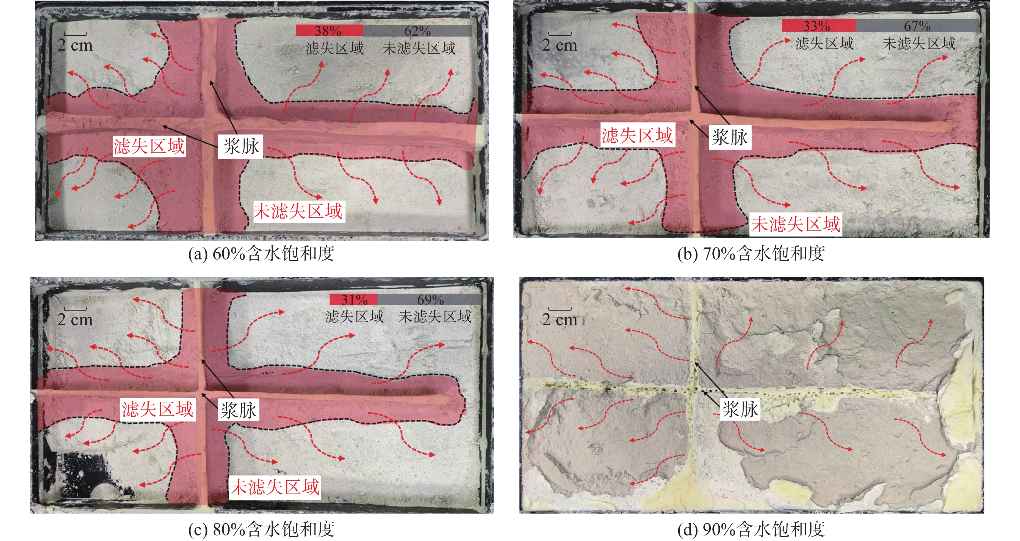 The dual-increasing stimulation slurry is a novel stimulation fluid developed for weakly cemented reservoirs, such as submarine methane-hydrate-bearing silty sandstones. After injection into the formation, it consolidates to form porous-media slurry veins that enhance permeability. This study employed a slurry fracture flow visualization apparatus to investigate the flow characteristics of the slurry within muddy silty sediments. The experiments revealed the influence of geological parameters, slurry formulation, and operational parameters on slurry flow, fluid loss, and slurry-vein porosity. The results indicate that the slurry flows uniformly and exhibits a convex fracture flow profile, flowing to the end of main fracture and branch fracture, effectively filling fractures. Lower fluid loss increases the proportion of medium-to-large pores within the slurry veins. Adjusting the slurry formulation can reduce fluid loss in formations of varying permeability, whereas a high injection rate expands the fluid loss zone. The effective porosity ranges from 50% to 60% with a uniformly distributed pore space, forming a structure dominated by large pores (pore diameter > 50 nm) and densely distributed micro- to mesopores (pore diameter < 50 nm). This pore network can serve as high-conductivity channels for gas and water migration, while the dense distribution of small and medium pores is conducive to sand control.